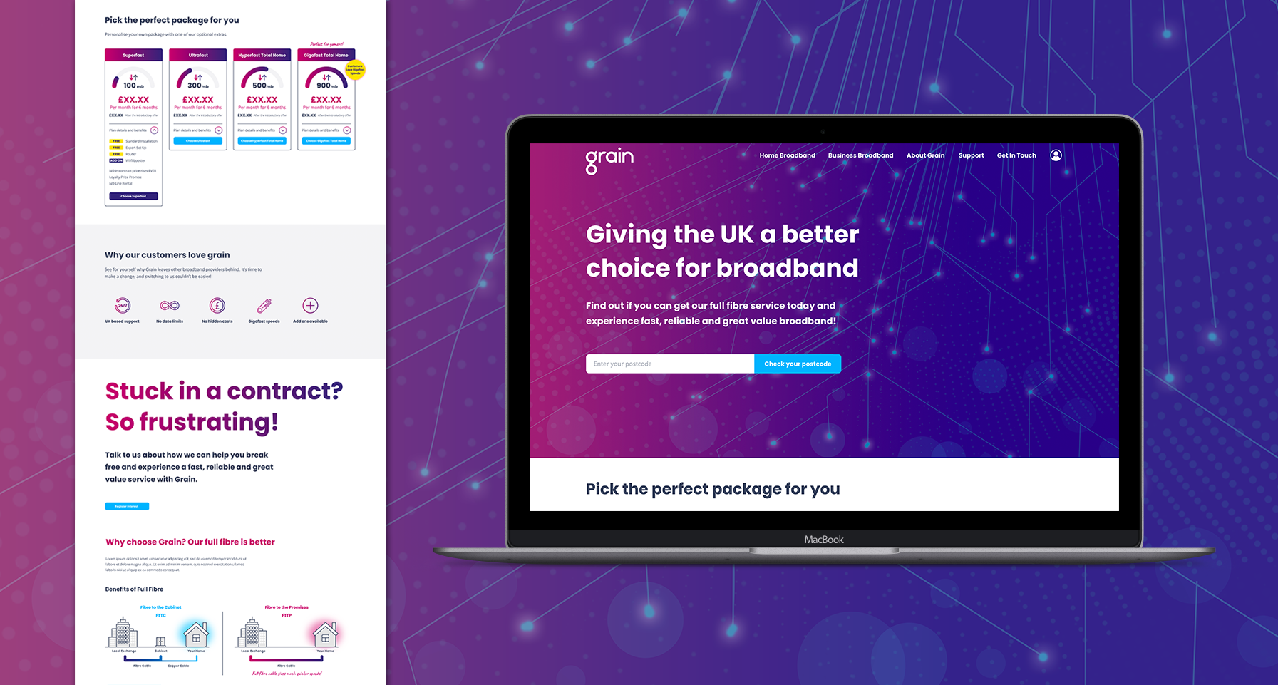 Grain are a full fibre broadband provider who are currently expanding across the UK in both the residential and business sectors. They wanted a website that would provide a more exciting user experience and ensure that the sign up journey was as straight forward as it could be. They also wanted to be able to easily update the site for monthly promotions and price changes,